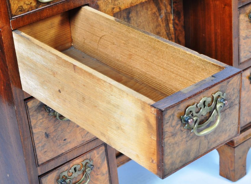 An antique 18th Century Georgian II figured walnut ladies kneehole writing table desk having a stepped edge top with two banks of drawers united by a knee hole cupboard. The drawer fascias having brass armor drop handle backplates and raised on bracket feet. Secret drawer to the frieze. Measures approx; 75cm x 80cm x 49cm.;