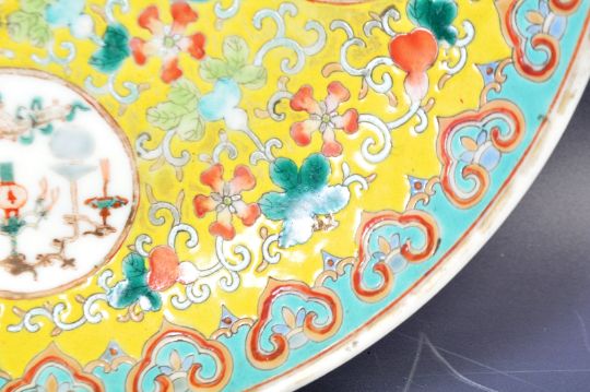 A 19th Century Chinese Guangxu period antique porcelain plate having a hand painted Famille Jaune ground with hand enamelled decoration depicting scrolls, leaves, fruit and flowers. Central cobalt Shou character medallion for Longevity and Double Happiness flanked by four white cartouche panels depicting The Precious Objects. Further decoration to the underside. Four ocher red character marks in kaishu script for the Guangxu Emperor. Measures: 23.5cm wide. Condition: One chip to rim and two hairline cracks.