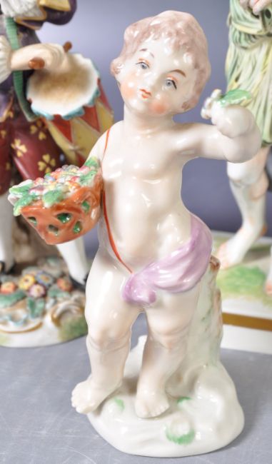 A collection of antique porcelain cabinet figurines comprising a 19th Century Naples mark Italian Grand Tour figurine of classical form depicting a Goddess / Maiden raised on square base, smaller Naples mark putti / cherub holding basket of flowers along with a Samson of Paris Derby Manner figurine of a drummer boy with naples mark to base. Largest measures; 19cm tall.