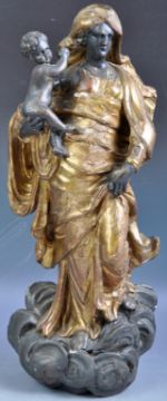 An antique 18th Century Religious Ecclesiastical carved limewood figurine of The Madonna & Child Christ. The figure having gilded clothing and ebonised features raised on a scrolled base. Likely an early Portuguese example. Measures approx; 41cm tall.