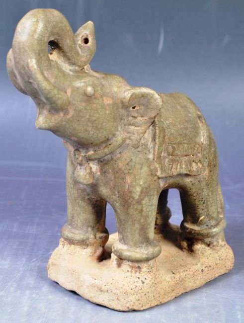 An antique Chinese Oriental glazed pottery figure of an elephant in the manner of Song Dynasty example. Faded green crackle glass finish raised on stone base. Measures approx; 15cm x 10cm x 7cm.