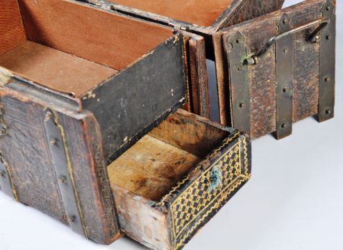 An antique 16th Century French embossed leather and iron bound casket box having a hinged domed topped lid opens to reveal fitted in interior. Patterned embossed decoration to the leather throughout with the right having a sliding lift panel side opening to reveal a hidden drawer within. Swing handles to the top and each side. The interior being relined in leather in the 19th Century. Measures approx; 16cm x 18cm x 11cm.