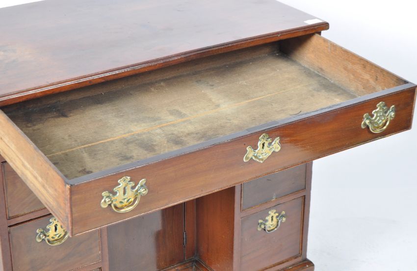 An antique 18th Century Georgian mahogany kneehole desk / writing table desk having a chamfered edge top with single drawer to the frieze over two banks of three drawers. The central knee hole having a inset cupboard with fitted shelves. All raised on bracket feet. Each fascias having brass armorial backplates with swing handles. Measures approx; 77cm x 82cm x 50cm.