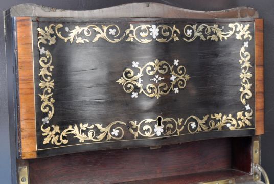An impressive antique 19th Century walnut & ebony serpentine boulle work liqueur set box having large ebony panels with brass scrollwork inlay and bone detailing. The hinged lid folds and opens to reveal a complete glass liquor set stand with four decanters and multiple drinking glasses. Measures approx; 26cm x 33cm x 25cm.