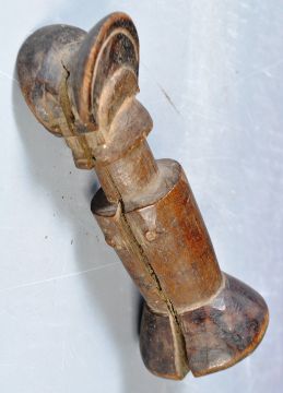 An antique Kwere people Tanzanian carved wood Mwani Hiti abstract form female figure fertility figurine / fertility doll having a shaped twin section head, shaped front and domed base. Measures approx; 14cm tall.