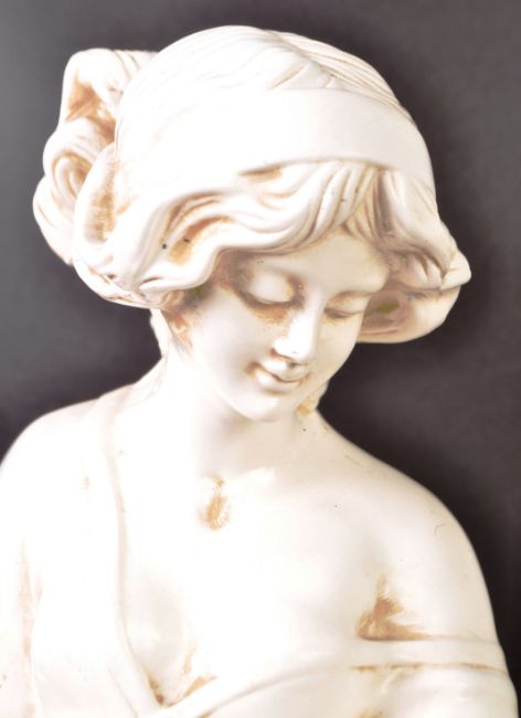 A 20th Century English antique style blanc de chine terracotta lady statue figure. The lady stood holding floral garland to her waist with further floral detailing to the base. All being raised on a classical circular base. Measures approx; 66cm x 18cm.