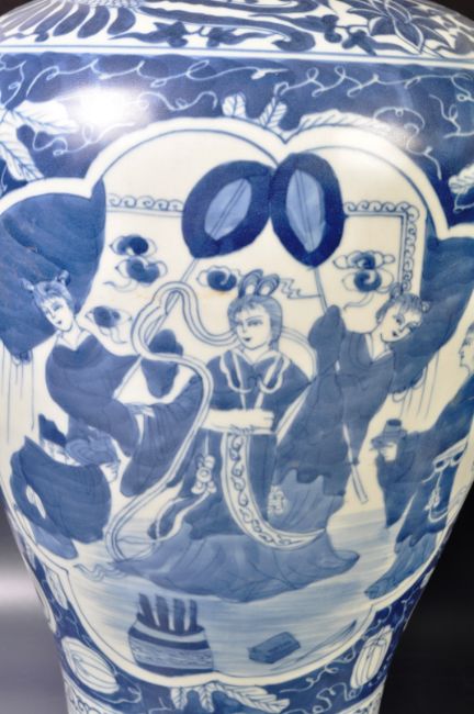 A pair of large 20th Century Chinese Republic period Wanli mark (1573-1619) Ming Dynasty revival porcelain vases of Meiping plum shape having hand painted blue and white decoration depicting court scenes with figures and panel detailing. Six character Wanli mark in underglaze blue to underside. Measures approx; 40cm tall. No visible damage.