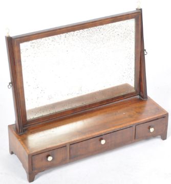 An antique 18th Century English George III Regency mahogany inlaid toilet swing mirror of rectangular having two upright supports with ivory finials atop. Inlaid banding to the frame housing the good foxed mirror panel. All being raised upon a mahogany three drawer base with ivory handles upon bracket feet supports. Measures approx; 51cm x 57cm x 20cm.
