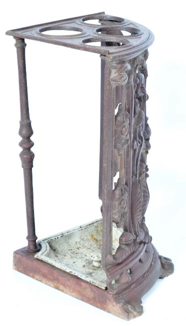 An antique 19th Century Victorian cast iron corner stickstand / stick stand or umbrella stand in the manner of Coalbrookdale. The stand of demilune shape with four holes to the drop, ornate cast sides with scrolling leaves and original removable drip tray still present. Date lozenge to verso. Measures approx; 56cm x 33cm x 33cm.