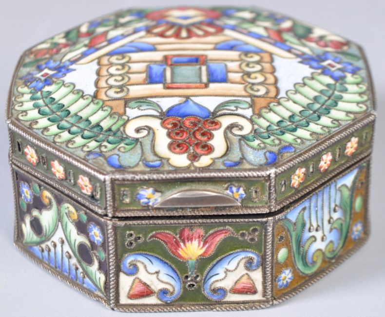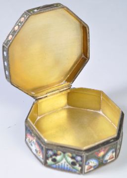 An antique early 20th Century Russian enamel on silver pill box in the manner of Faberge. The pot of octagonal form with hinged lid opening to reveal a gilded interior. Profusely decorated with graduating cloisonne enamels in the Art Nouveau style. Stamped to base for 84 (875 silver) Moscow Kokoshnik mark with 20A 20th Artel makers stamp but heavily influenced by designs from the 11th Artel. Measures approx; 2.5cm x 6cm. Weighs; 108 grams.