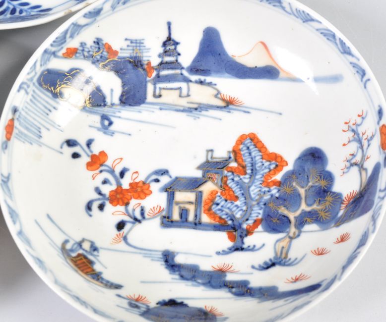 A group of three antique 18th Century Chinese Oriental small saucer dishes / plates. One export late 18th Century example with hand painted / enameled court scene to the center. The other two being early 18th Kangxi period one having blue and white elder figure decoration interspersed with floral detailing and six character marks to the base with the other in the Chinese Imari Pattern. Largest measures approx; 13cm diameter.