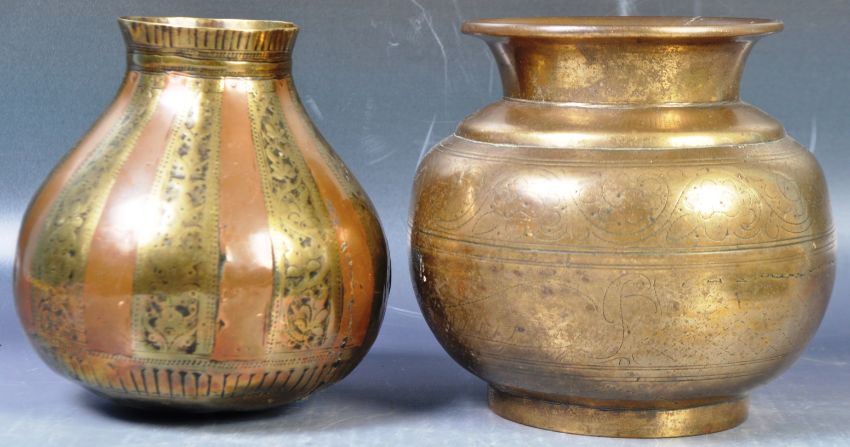 Two antique 18th / 19th Century brass / bronze bowls or pots comprising a copper and brass example of bulb shape likely Persian along with a heavy Georgian example with engraved detailing throughout. Largest measures approx; 13cm tall..