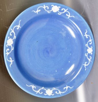 An antique 19th Century Chinese Oriental powder blue finished bowl having a raised lipped rim with white scroll and floral detailing. Further floral detailing to the underside with all being raised on a circular foot. Measures approx; 5cm x 27cm diameter.