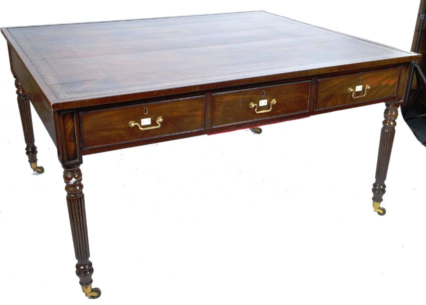 An impressive antique 19th Century mahogany partners desk library writing table having a beautiful tooled cigarette brown leather writing sciver to the table top being gilt tooled to the borders. Both sides of the desk being set with three locking drawers to the frieze and having brass swing handles. All raised on turned reeded column legs with brass castors. One handle slightly misshapen. Measures approx; 80cm x 154cm x 124cm. Floor to base height 61cm.