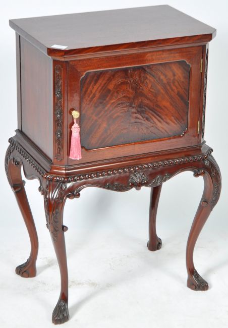 A 20th Century antique revival flame / plum pudding mahogany pot cupboard / bedside cabinet having a front canted top with good grain door to front. Carved canted corners with spacious open interior. The legs and apron further carved with acanthus & oak leaved with garooning borders. A good quality reproduction example. Measures approx; 82cm x 51cm x 34cm