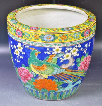An antique early 20th Century Chinese Republic period Oriental porcelain large brush pot / jardiniere planter vase of good size having hand painted enamel decoration depicting flowers and blossoming prunus flowers on a cobalt blue ground. Marked to base. Condition; no visible damage.