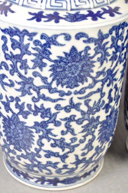 A pair of 20th Century Chinese Republic period Qianlong mark (1736-1795) porcelain vases of Rouleau shape having hand painted blue and white decoration depicting scrolling leaves and blossoming floral medallions. The tapered neck having twin handles with ceramic rings. Greek key border to the top of the body. The underside having a six character Qianlong mark in underglaze blue Zhuanshu script. Measures approx; 31cm tall. Condition, some wear to ring handles, hairline to one rim.