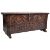 An antique 16th Century Spanish Gothic carved fruitwood / chestnut coffer mule chest blanket box cassone. The hinged lid having a wrought iron lock and hinges. The front intricately carved with two large Gothic windows / arches with panels bordered by carved corners with large central shaped lock plate. All raised on trestle feet supports. The top is likely a replacement, crude repair to base and age related wear throughout. Measures approx; 56cm x 129cm x 40cm.