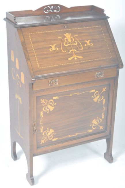 Attributed to Shapland & Petter for Liberty & Co - An antique late 19th Century Arts & Crafts / Art Nouveau mahogany and stencil inlaid students bureau desk of good proportions. Fret pierced gallery top with stencilled floral drop down front opening to reveal a maple fronted drawered interior with open storage sections and moroccan red leather gilt tooled writing sciver with brass fittings. Single drawer to the frieze with copper stylised drop handles and backplates over a stencilled inlay inset panel cabinet cupboard door opening to reveal an adjustable shelf interior. Further stenciling to the interior with All raised on shaped arched legs. Measures approx; 103cm x 62cm x 40cm.