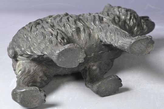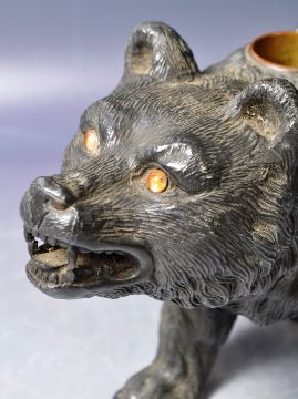 An antique 19th Century Victorian English Black Forest style spelter bear modelled as an inkwell. The bear on all fours having a large and small brass lined wells to his back and being set with glass eyes. Fine detailing to the fur. Measures approx; 16cm x 26cm x 9cm.