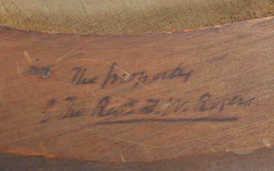 An antique mid 19th Century Victorian English oil on canvas portrait painting study depicting a clergyman gentleman in black coat with bowtie modelled wearing a pair of spectacles having arm in jacket. Set to a good period ornate gilt frame. Notation to reverse reading ' Brother Whitworth 1848 The Property of the Reverend FW Rogers ' Measures approx; 96cm x 81cm.