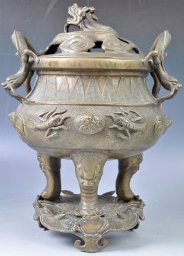 A 19th Century Chinese antique bronze lidded incense burner censer ding prayer bowl provenance. The impressive example having a dragon finial lid with pierced detailing, large twin dragon handles and decorated in relief with zodiac animals. Raised on large tripod feet with matching pierced base. Measures: 37cm x 25cm.  Provenance: Once belonged to Doctor George Lindin In Charge of Health Service Saigon with an attached note.