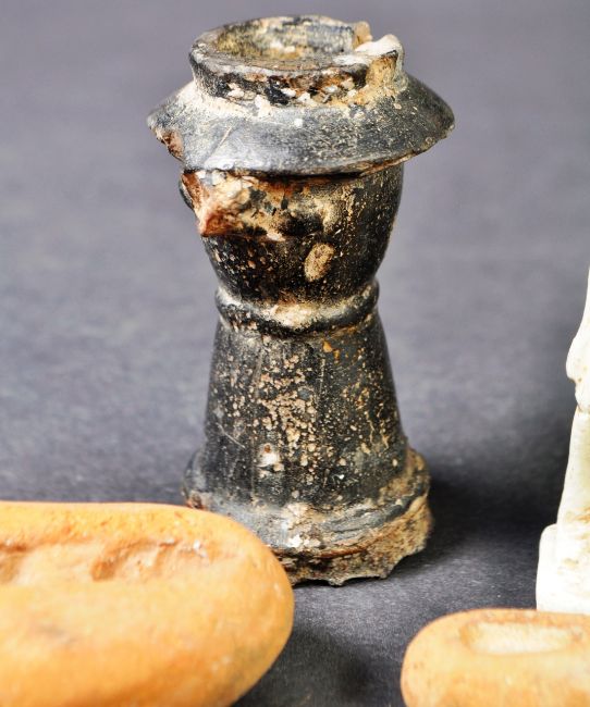 Egyptian Artifacts - A collection of 7x Ancient Egyptian artifacts to include three small terracotta amulet moulds, a larger terracotta seated Sekhmet amulet mould, ancient neck of a broken ritual vessel, Late Period amulet of an Apis Bull in green Faience and a Late Period white faience striding figure depicting Thoth The Ibis headed Moon God. All these items are believed be genuine Ancient artifacts. Largest measures; 7cm.