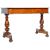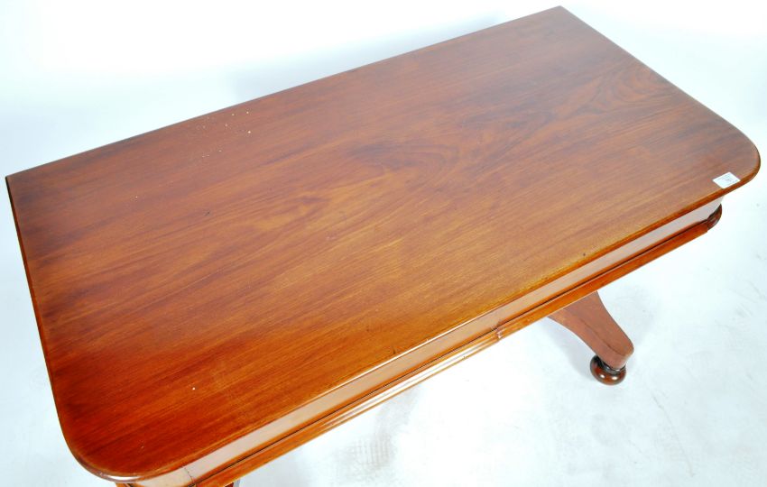 An antique 19th Century Victorian English mahogany double drawer side table / writing desk having rounded rectangular top with two hidden drawers below. The top supported by two turned columns upon bun feet and castors. Measures approx; 72cm x 106cm x 54cm.