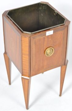 An antique 19th Century walnut wine bucket / champagne bottle holder having an inset brass liner with canted sides and armorial gilt brass ring handles and line inlay borders with shell cameo panels. All raised on tapering square legs with brass ball feet.. Measures approx; 52cm x 28cm x 28cm.