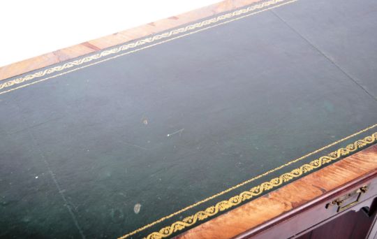 An antique late 19th Century Victorian English Aesthetic movement mahogany twin pedestal writing table desk of good proportions in the manner of James Shoolbred & Co. Comprises a black gilt tooled leather writing skiver with central drawer above the knee hole recess flanked by two banks of four graduating drawers. Each fascia having architectural brass drop handles. Raised on black ceramic castors. A good practical piece of furniture. Measures approx 76cm x 131cm x 61cm. Knee hole approx 61cm x 61cm.