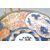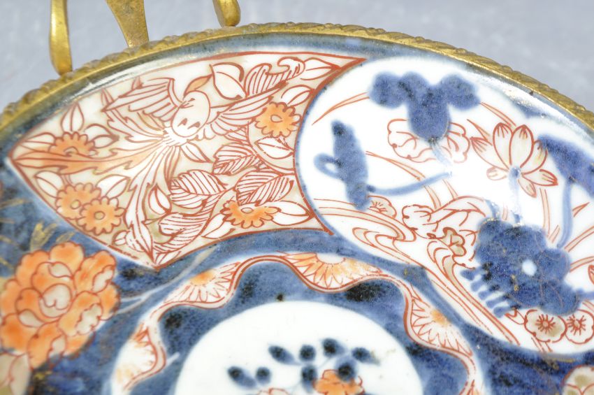 An antique 19th Century Japanese Oriental Meiji Period porcelain plate / dish decorated in an Imari palette having gilt bronze ormolu mounts featuring a beaded edge, scrolled handles raised on swag adorned shell scroll feet base. Measures approx; 11cm x 21cm.