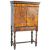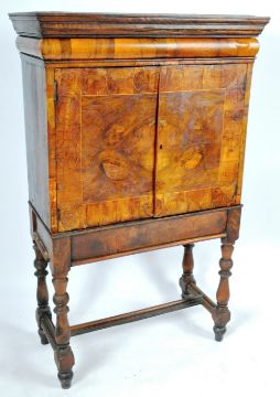 An antique 17th / 18th Century Queen Anne walnut cabinet on stand having a stepped square pediment top with slight bombe top over twin cabinet doors with line inlay and geometric patterns opening to reveal a fully functional and fitted interior. All raised on a later matched stand. Measures 160cm x 98cm x 46cm.