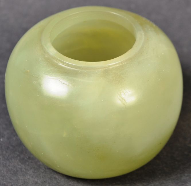An antique 19th Century Chinese Oriental hand carved Bowenite hardstone inkwell / ink pot or brush washer on stand in the form of a ginger jar. The vase of compressed squat form with plain sides, short circular rim and stepped base. Celadon green colour. The stand of archaic tripod form with carved grooves and Greek Key detailing to the legs / feet. Measures without stand 4cm x 5cm. Stand measures approx 2cm x 4.5cm.