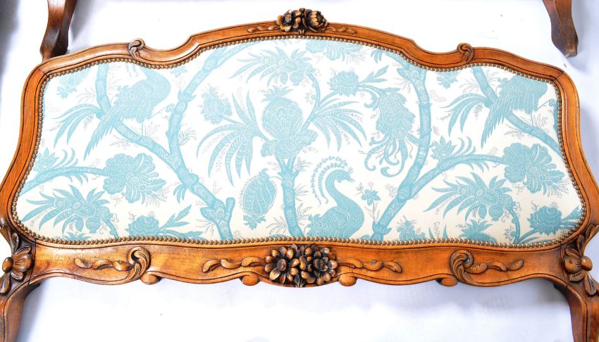 A French walnut double corbeille end carved bed in the manner of a Louis XV example. Carved floral detailing to each end with both having pad turquoise bird and floral upholstery with brass stud detailing. Headboard measures approx; 129cm x 139cm.