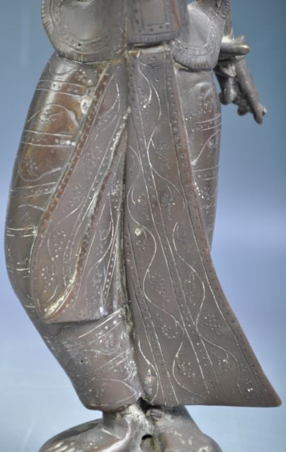 A believed antique 18th Century Chinese Burmese Oriental tall bronze figure with peaked hat and traditional garments raised on a circular pedestal base. Measures approx; 26cm tall.