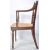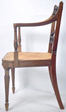 An antique early 19th Century Georgian Regency Period walnut / mahogany framed cane library salon armchair / desk arm chair having a decorative 'X' and circular helix backrest with reeded elbow rests raised on turned reeded columns. Bergere woven cane seat all raised on tapering reeded legs. Measures approx; 87cm x 53cm x 45cm.