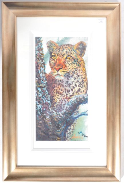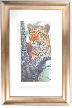 Rolf Harris - Australian Entertainer & Artist - Alert For Prey - An original limited edition signed / autographed Giclee print on paper depicting a spotted leopard tree landscape during dusk. Demontfort fine art certificate to verso. Complete in frame. Limited 16/195. Measures; 11"x22".