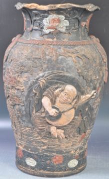 An antique 19th Century Japanese Meiji period terracotta hand painted vase having a flared rim with floral decoration to the waisted neck with rope detailing. The bulbous body depicting musicians amongst and floral scenic backdrop. Unmarked. Measures approx; 41cm x 27cm diameter.