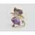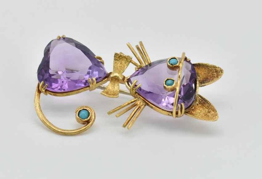 An 18ct gold amethyst and turquoise brooch in the form of a cat. The cat having heart cut amethyst head and body with turquoise eyes and tail finial. Roller clip clasp verso. Marked 18k. Total weight 9.6g / Measures 4cm