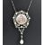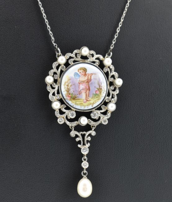 An 18ct gold pearl, enamel and diamond pendant necklace. The necklace strung with an open work pendant having a central hand painted enamel plaque of a cherub framed by pearl and diamond scroll work. Suspended pearl and diamond drop. Total weight  18g / measures 6.5cm / chain 40cm