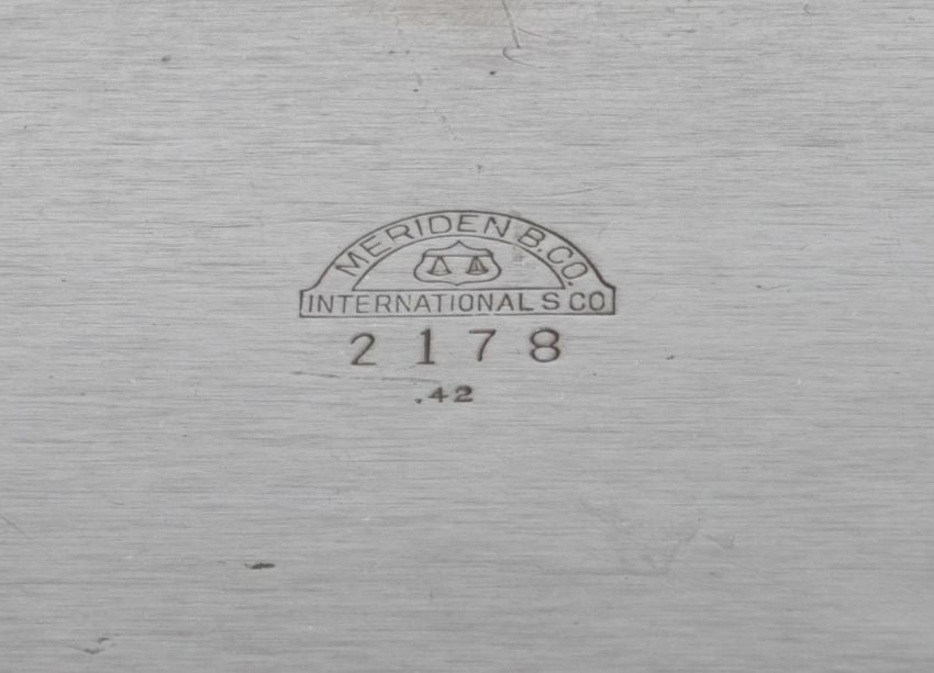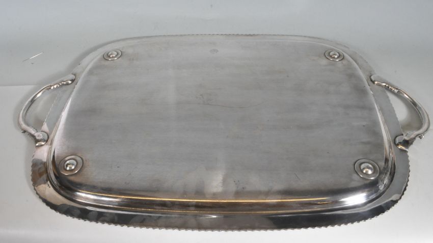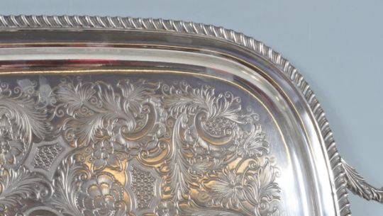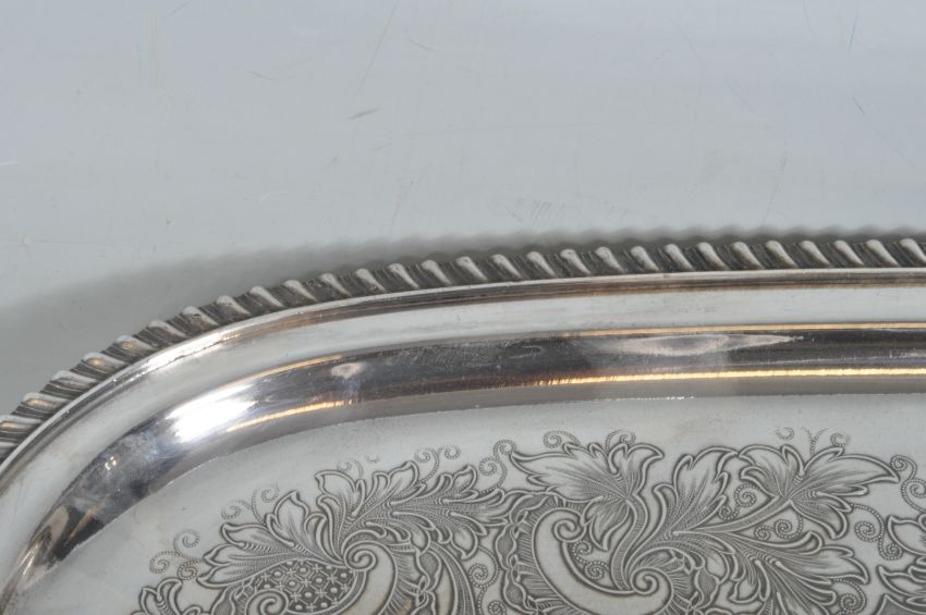A large late 20th century Meridon B & Co silver plated serving tray of rectangular form with a highly decorative floral etching to the tray surrounding an empty cartouche and gadrooning to the edges alongside foliate handles. Stamped to the base. Measures 67cm x 41cm.