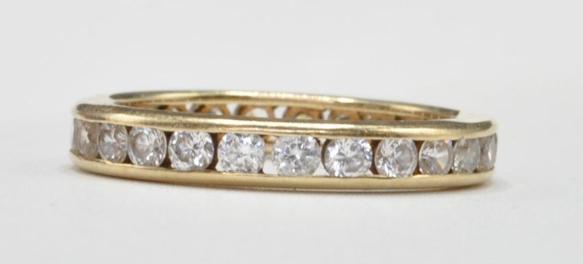 A 14ct gold and cz set full eternity ring. The band ring inset with bright cz round cut stones within yellow gold 14ct band. Total weight 3.2g / Size Q