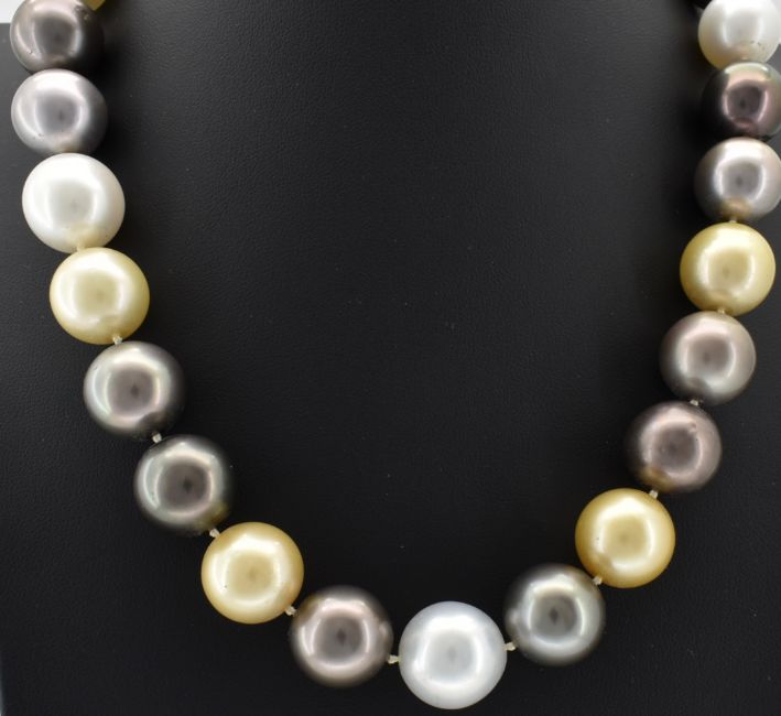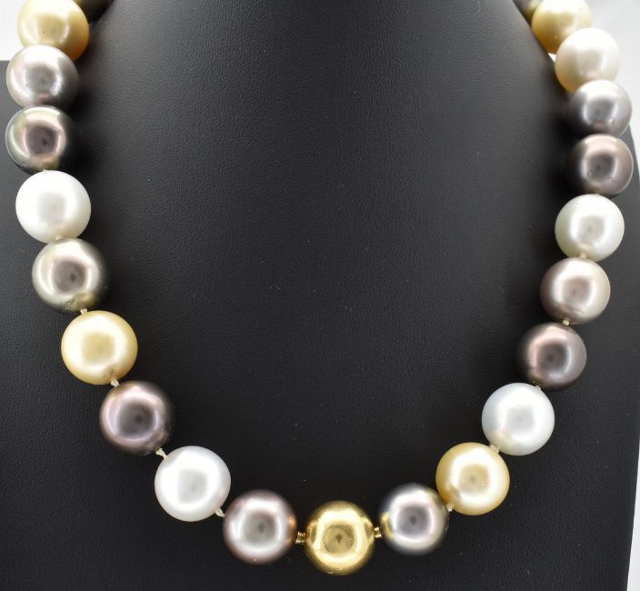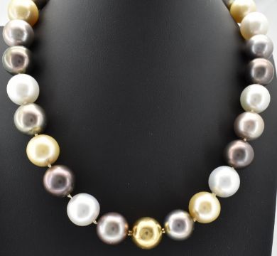 An 18ct gold and South Sea pearl necklace. The necklace strung with white chocolate and golden South Sea pearls united with gold clasp. The pearls measure 15mm round approx. Total length 48cm / Total weight 162g