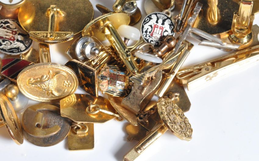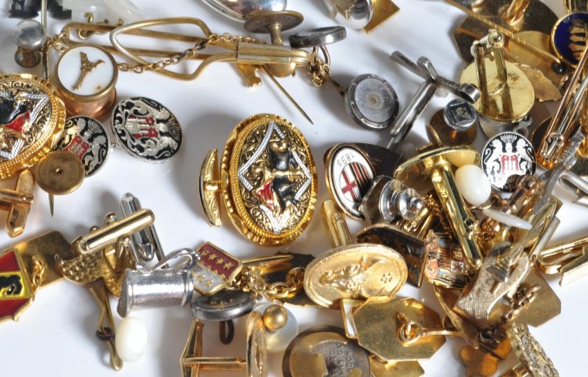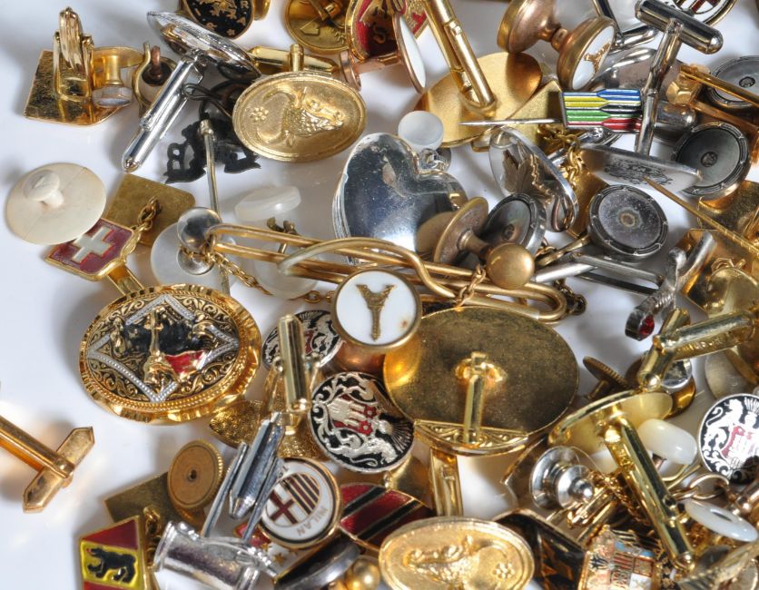 A large collection of vintage mens yellow metal cufflinks and badge. Many having enamelled crests and coat of arms relating to Spain, Switzerland, Salzberg and Gibraltar allongside several faux mother of pearl examples. Largest measuring 30mm x 26mm.