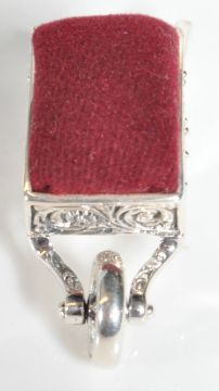 A stamped sterling silver pin cushion in the form of a wheel barrow with engraved patterning to the sides and red felt pin cushion atop, the wheel being articulated and fully functioning. Stamped to the underside. Measures 50mm long. Total weight 15.96g.