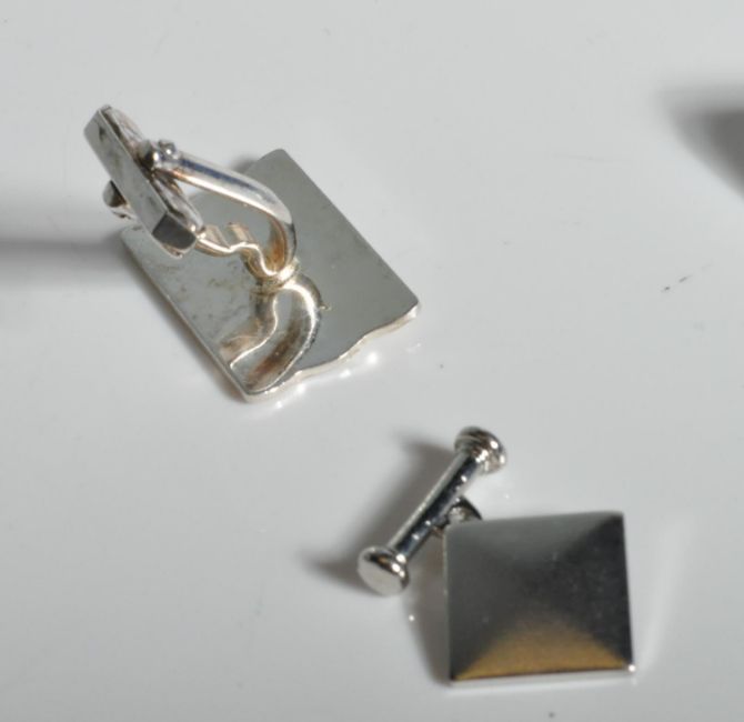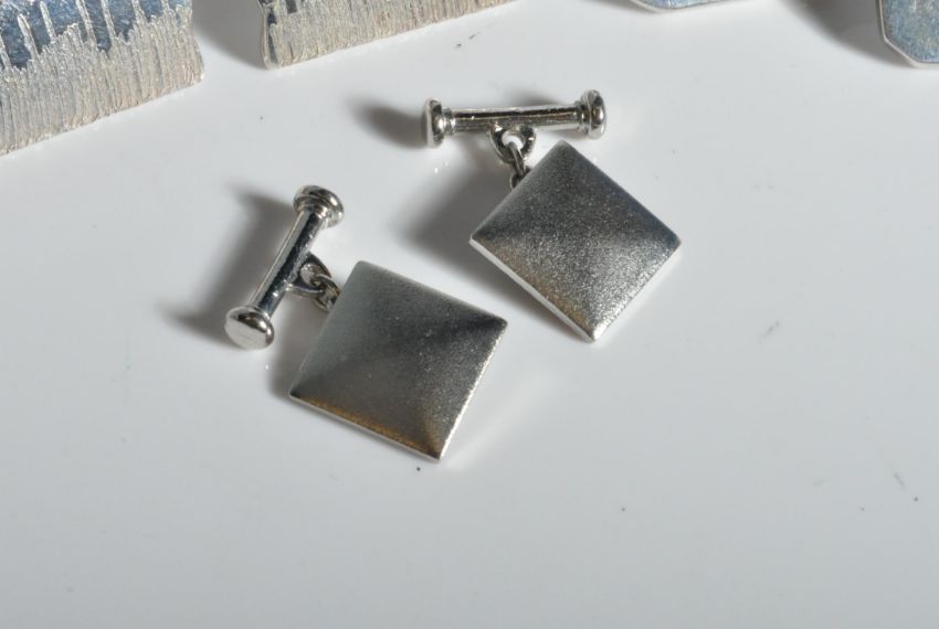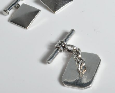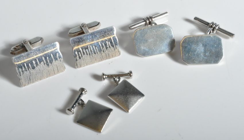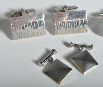 A collection of gentleman's silver cufflinks. Three sets to include 1 set united by chains, 2 with plain cartouche panels and one set with a chased reeds decoration. Total weight 30.2g