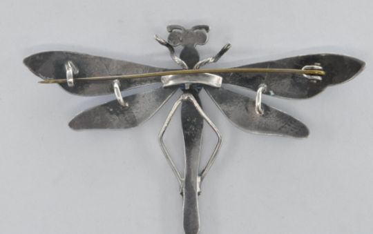 A vintage 20th Century silver dragonfly brooch having blue enamel to the wings and body with navy blue enamelled eyes. Unmarked, hinge pin to the verso. Measures 7cm wide.