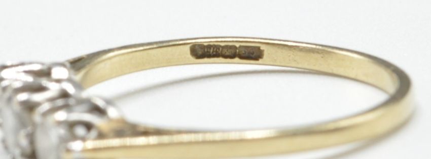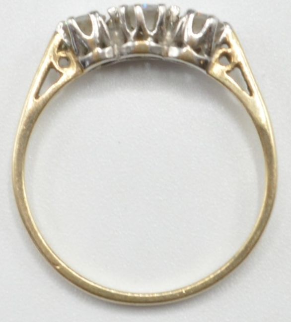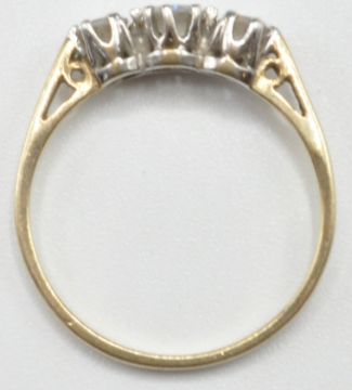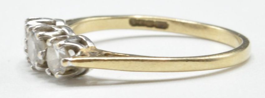 A 9ct gold and white stone ring set with three graduating round cut white stones in prong settings. Import marked 375. Weight 1.5g. Size N.5.