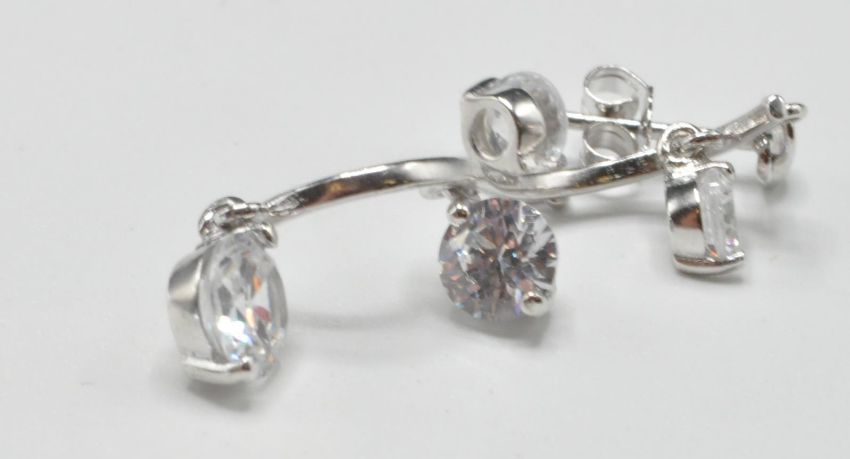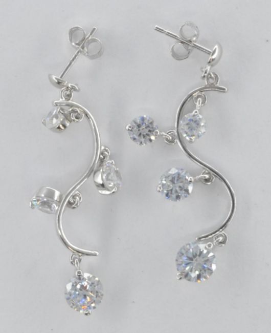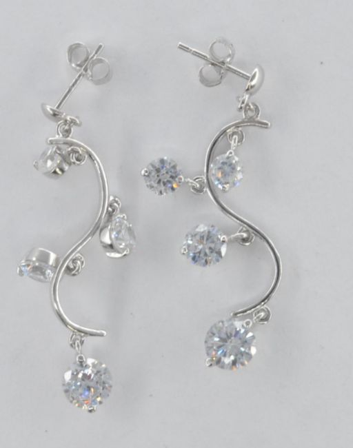 A pair of ladies silver and CZ drop earrings having curved silver drops each with four graduating CZ stones suspended from them. Marked 925 to the posts. Drops measure 4cm.