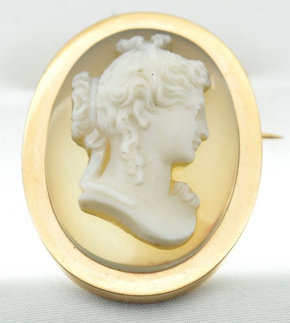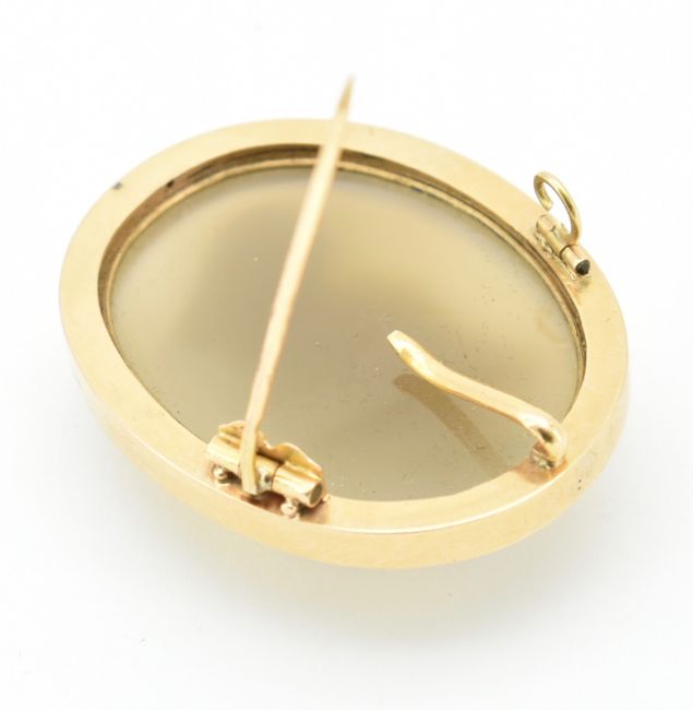 An 18ct gold and agate carved cameo brooch & pendant pin. The cameo set within an oval bezel setting with carved agate cameo of a lady having c-clasp pin and bale pendant verso. Total weight 16.7g / Measures 4cm x 3cm